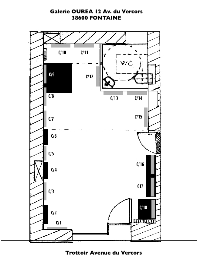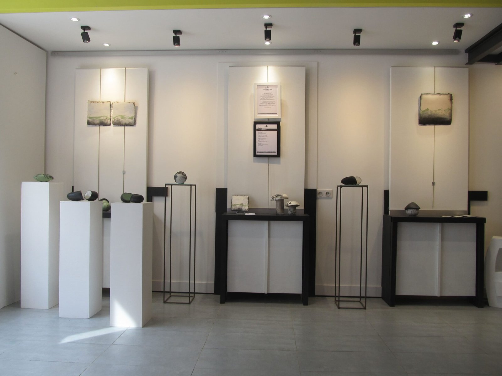 – Nombreuses cimaises, colonnes d’exposition pour sculptures, box de consultation libre service, petites vitrine pour bijoux