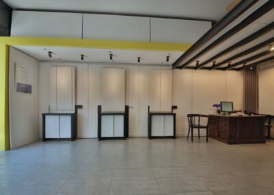 – Nombreuses cimaises, colonnes d’exposition pour sculptures, box de consultation libre service, petites vitrine pour bijoux