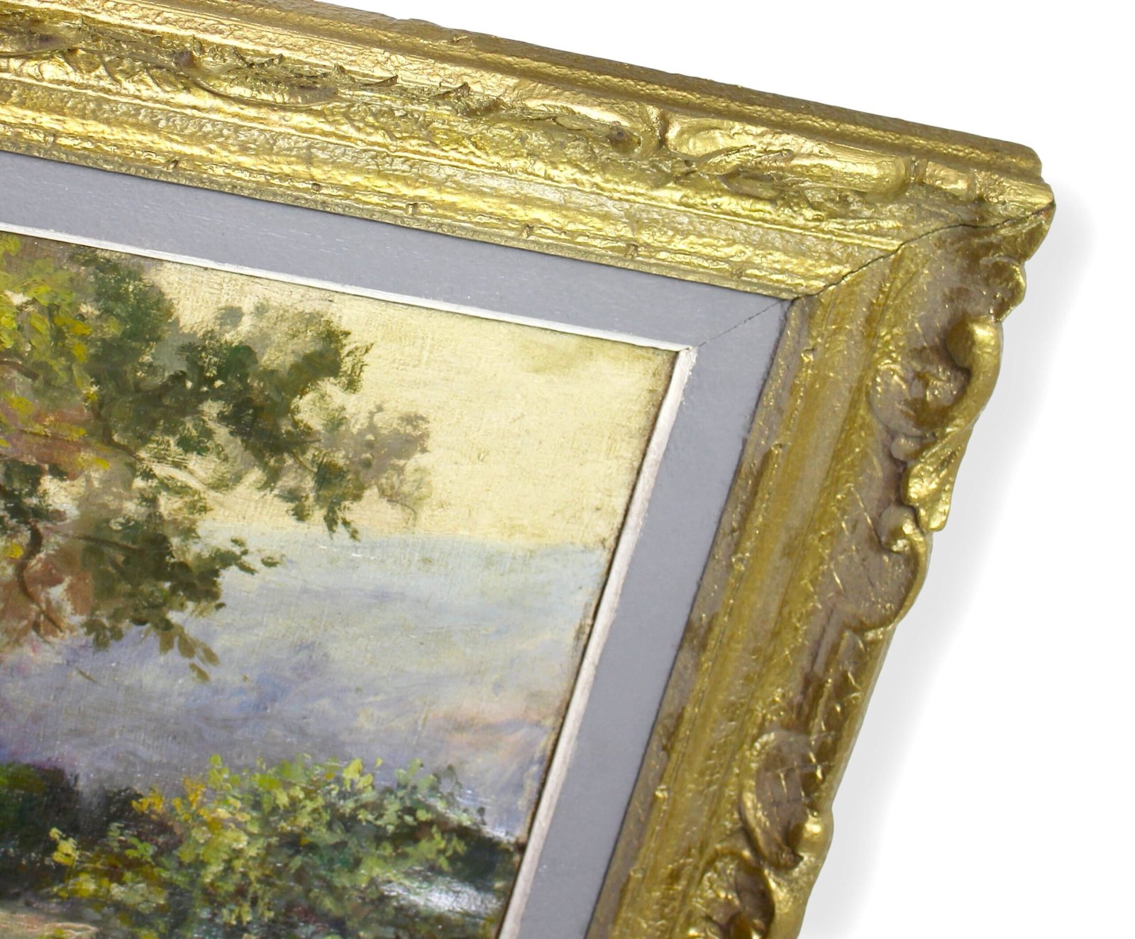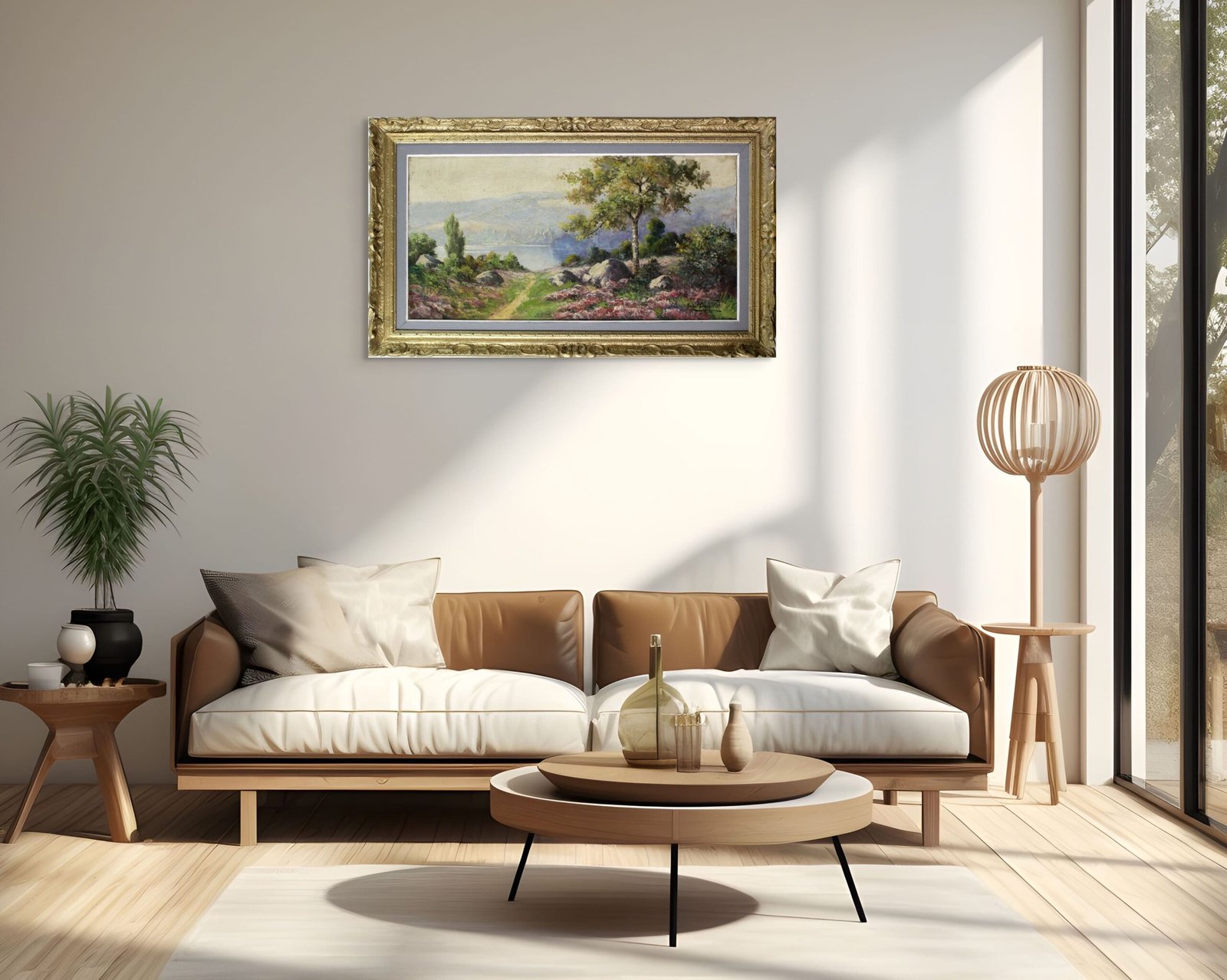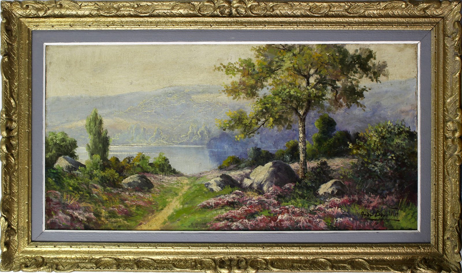 Cette huile sur toile d’André Bouville s’inscrit dans la tradition postimpressionniste française, avec un paysage lumineux structuré par un chemin menant vers le lac.