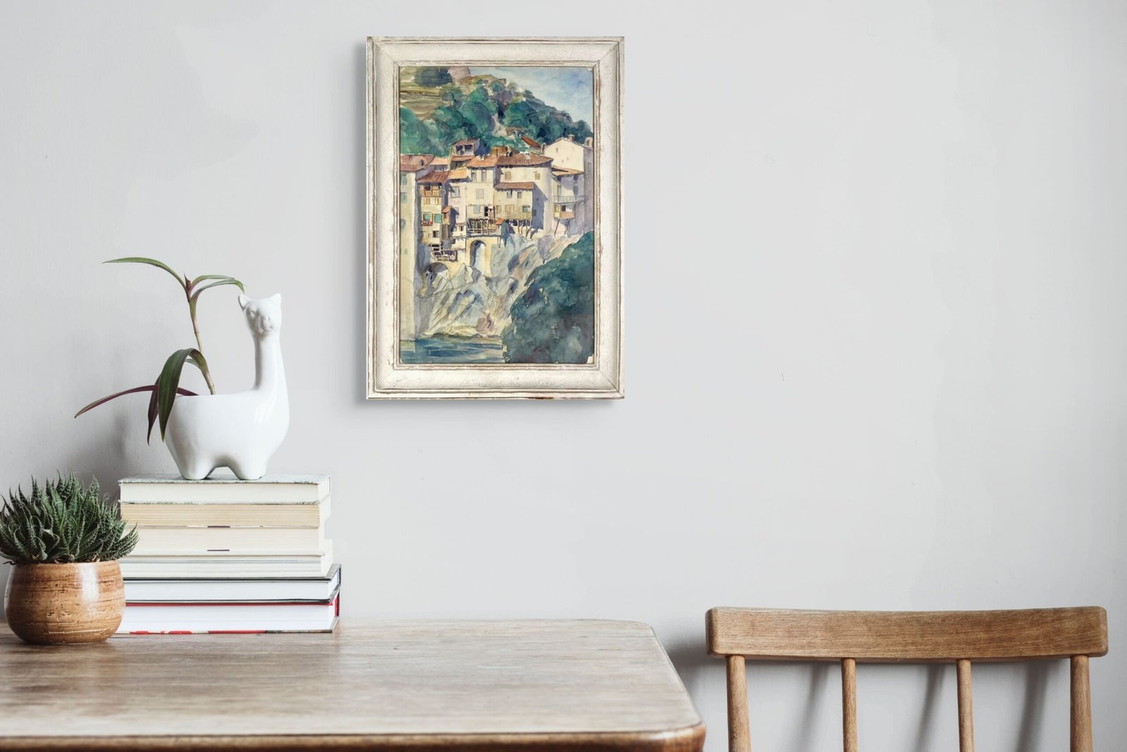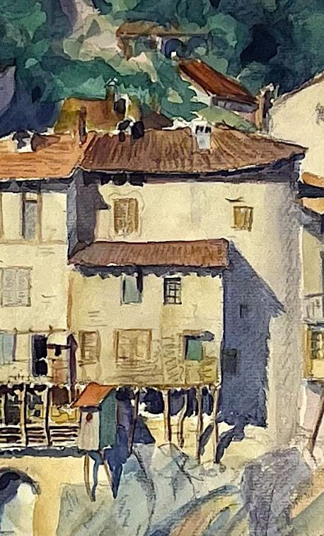 Cette aquarelle de Pont-en-Royans capture admirablement l’essence architecturale de ce village emblématique de l'Isère.
