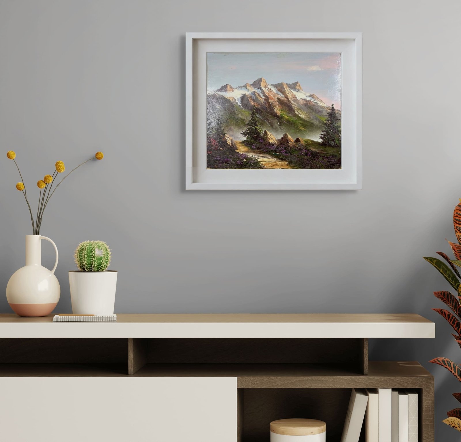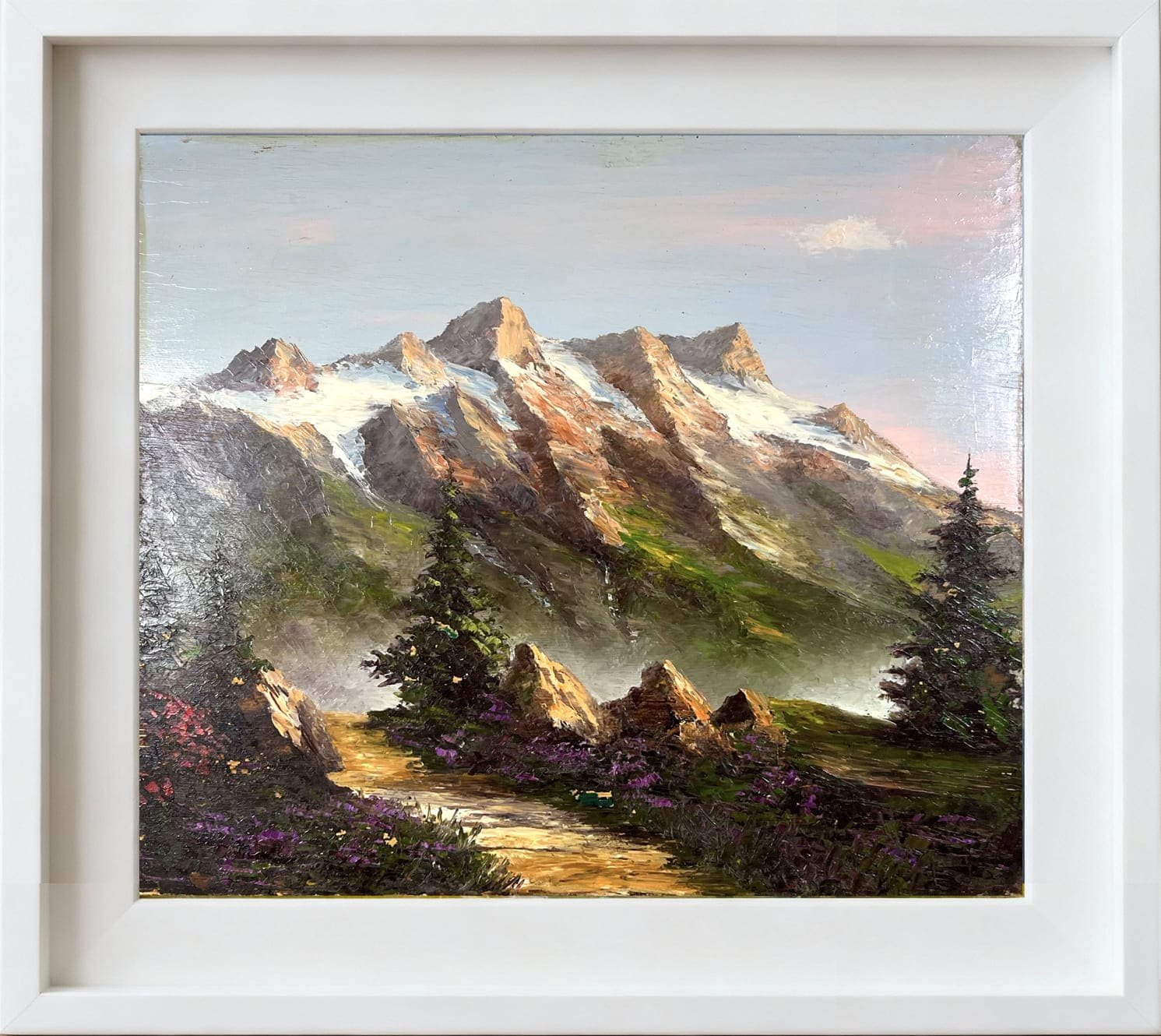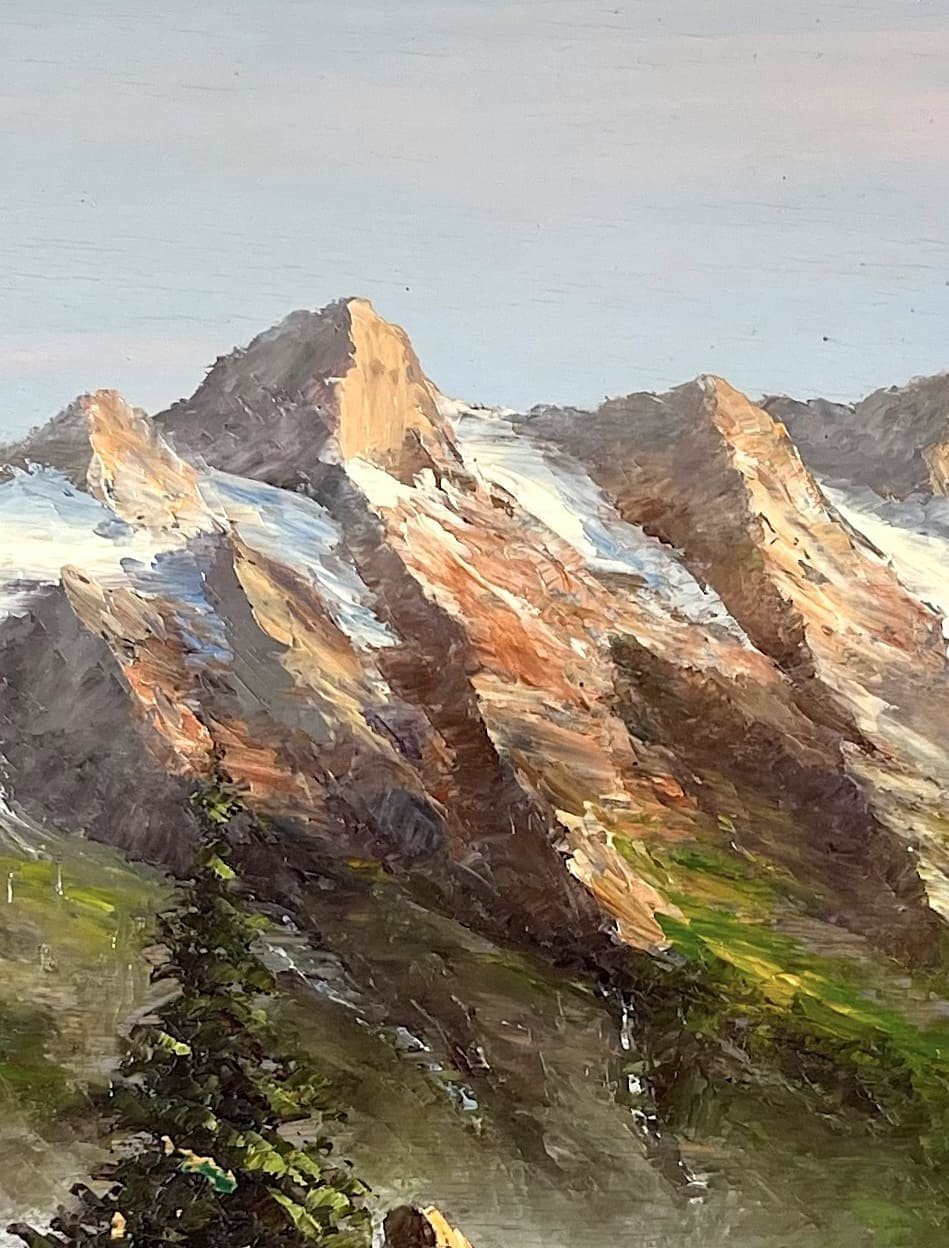 Cette huile sur panneau bois (43 x 37 cm) capture avec justesse les sommets enneigés qui se dressent