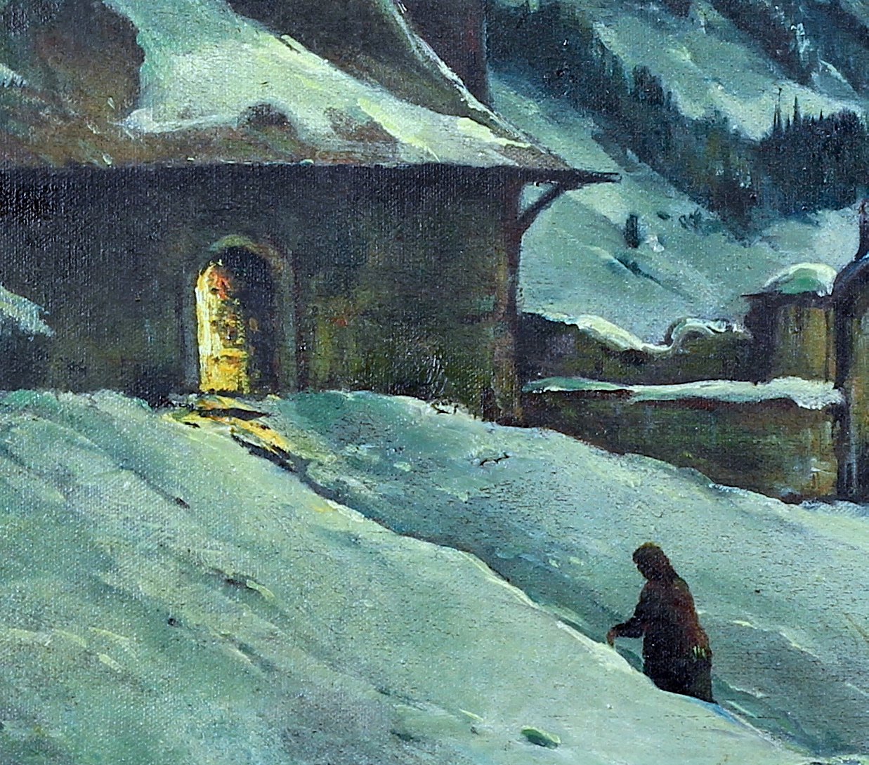 Hans Urban fut un peintre paysagiste actif dans la première moitié du XXᵉ siècle, probablement originaire ou établi dans la région du Tyrol. Son œuvre se concentre sur la représentation de paysages alpins — villages de montagne, églises isolées, vallées enneigées — souvent baignés d’une lumière crépusculaire ou lunaire. Ses tableaux, généralement peints à l’huile sur toile, se distinguent par un naturalisme romantique et une attention minutieuse aux effets de neige et de clair-obscur.