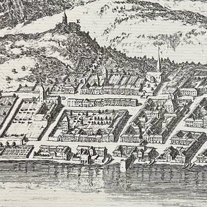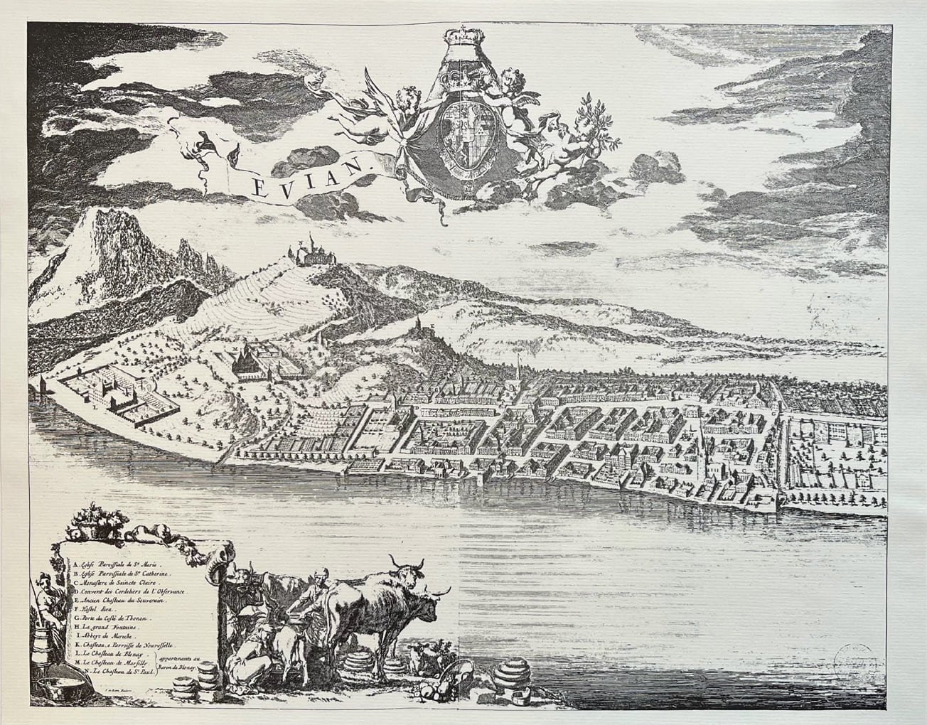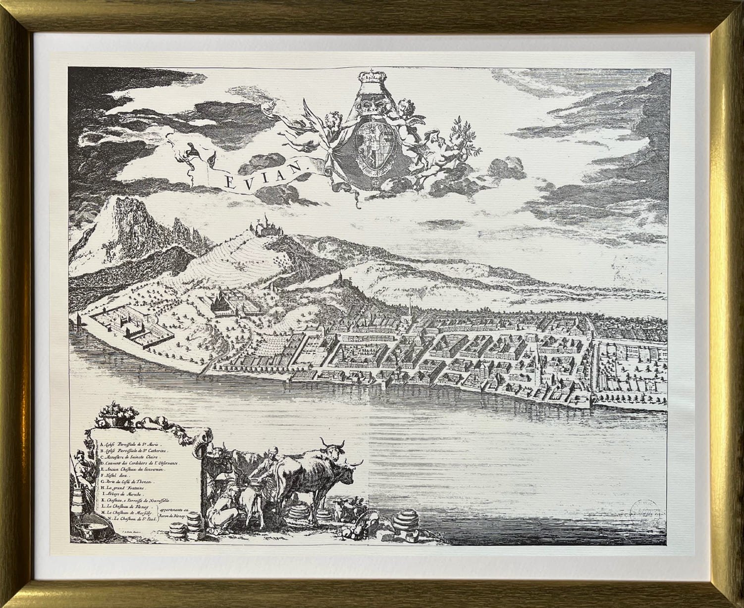Gravure ancienne plan cavalier d’ Evian 17 ième