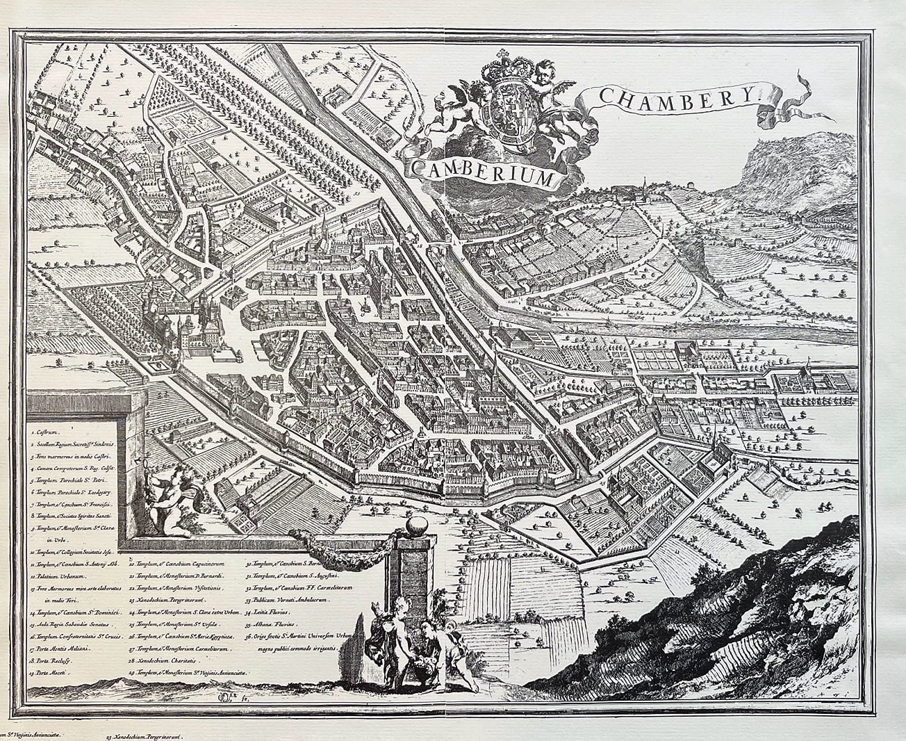Ce plan cavalier de Chambéry est tiré du Theatrum Sabaudiae de Blaeu, d'après les dessins de Gioan-Tomasso Borgonio (1682)