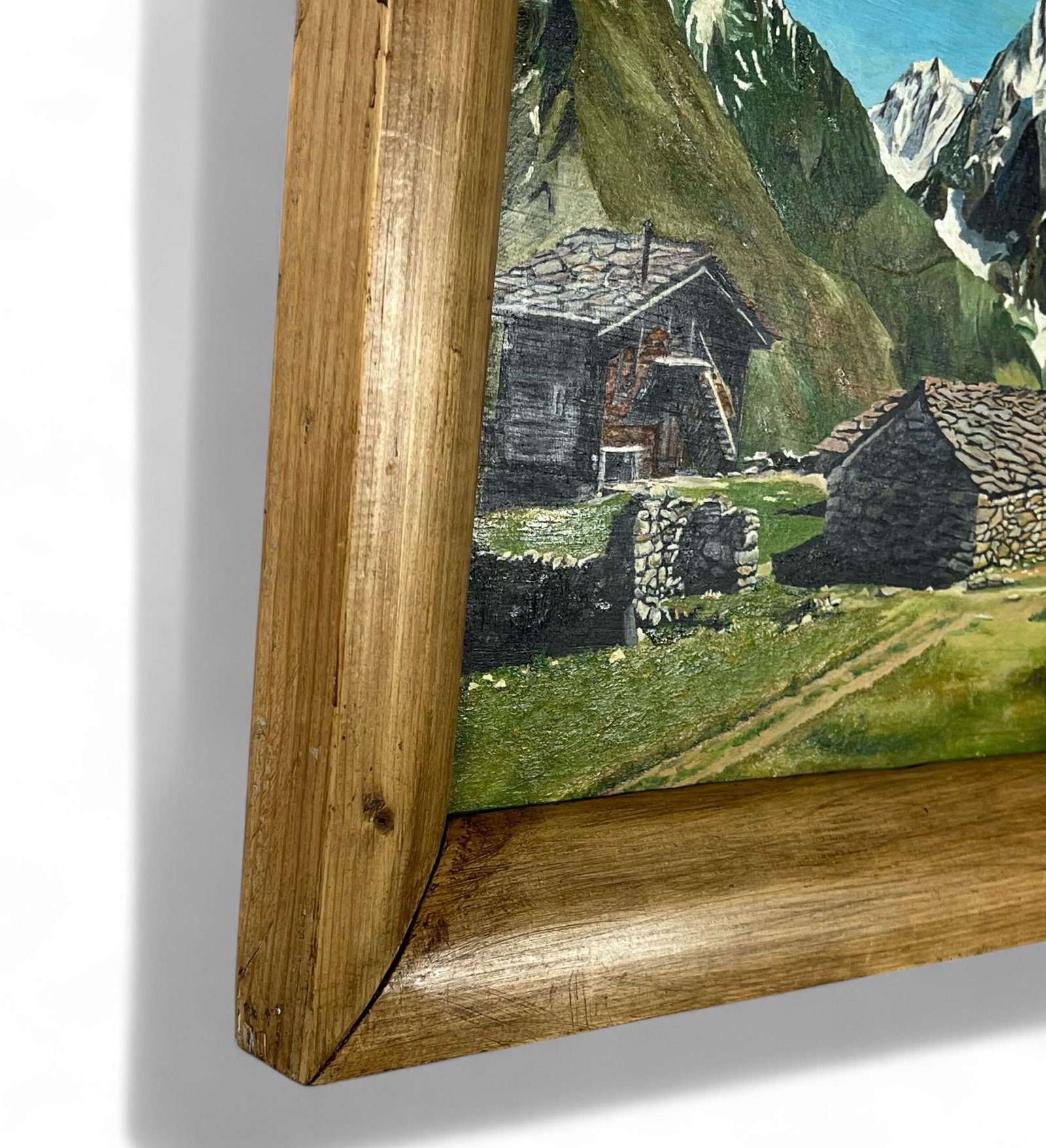 Huile sur bois représentant des chalets alpins dans un décor de haute montagne.