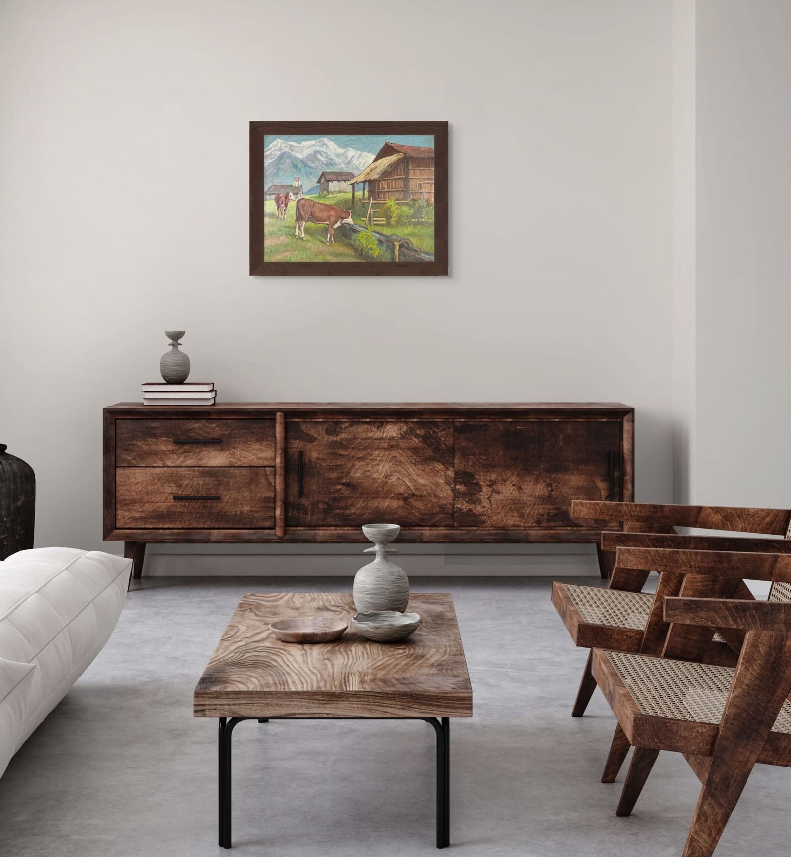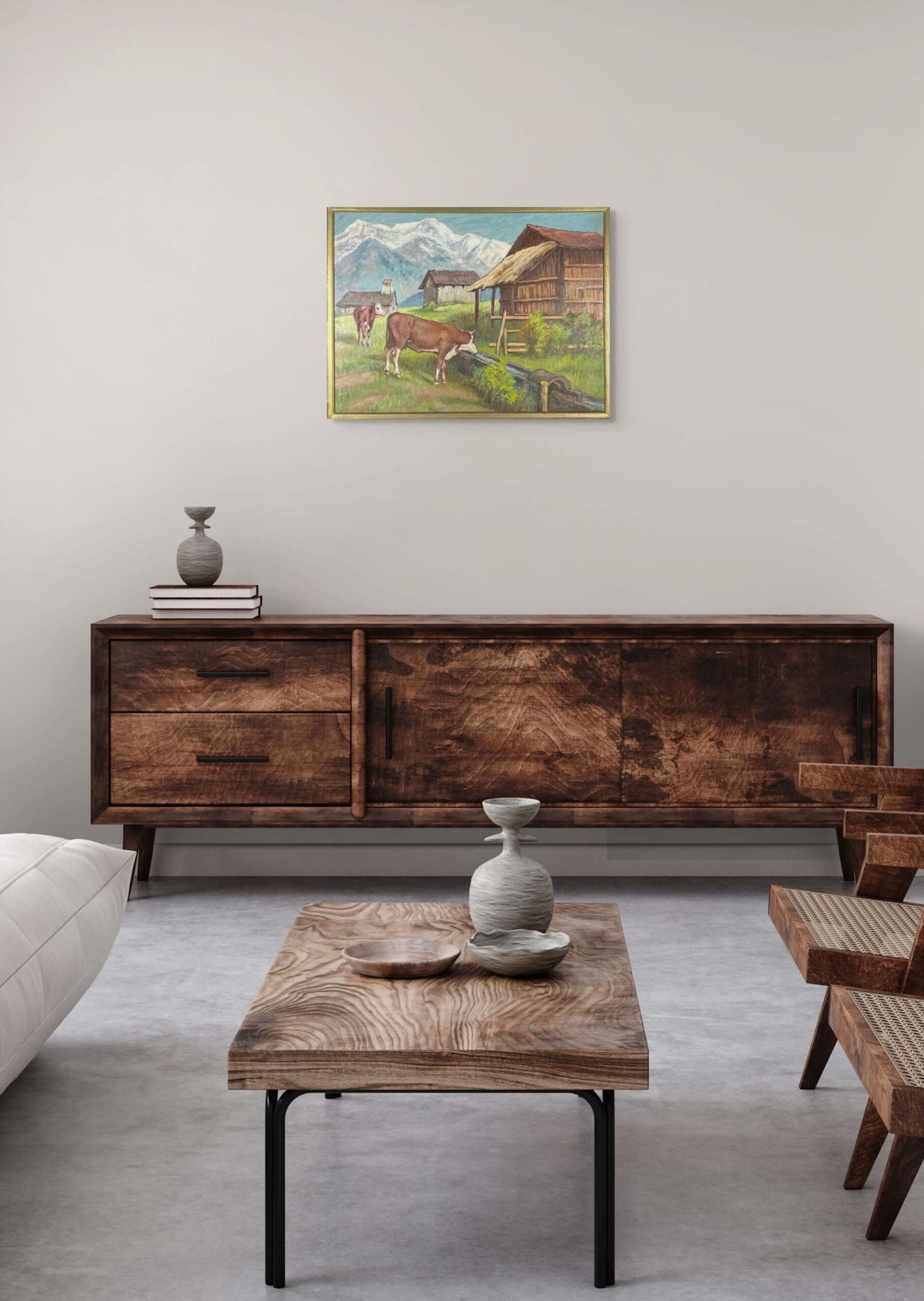 La palette oppose les bruns chauds des bâtisses et des animaux aux verts des pâturages et aux blancs éclatants des sommets.