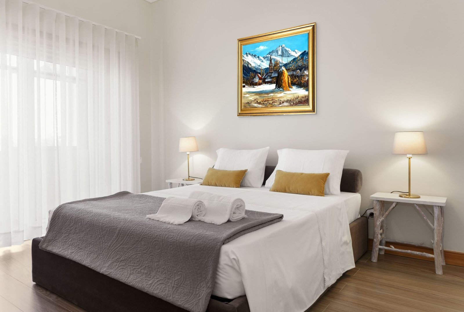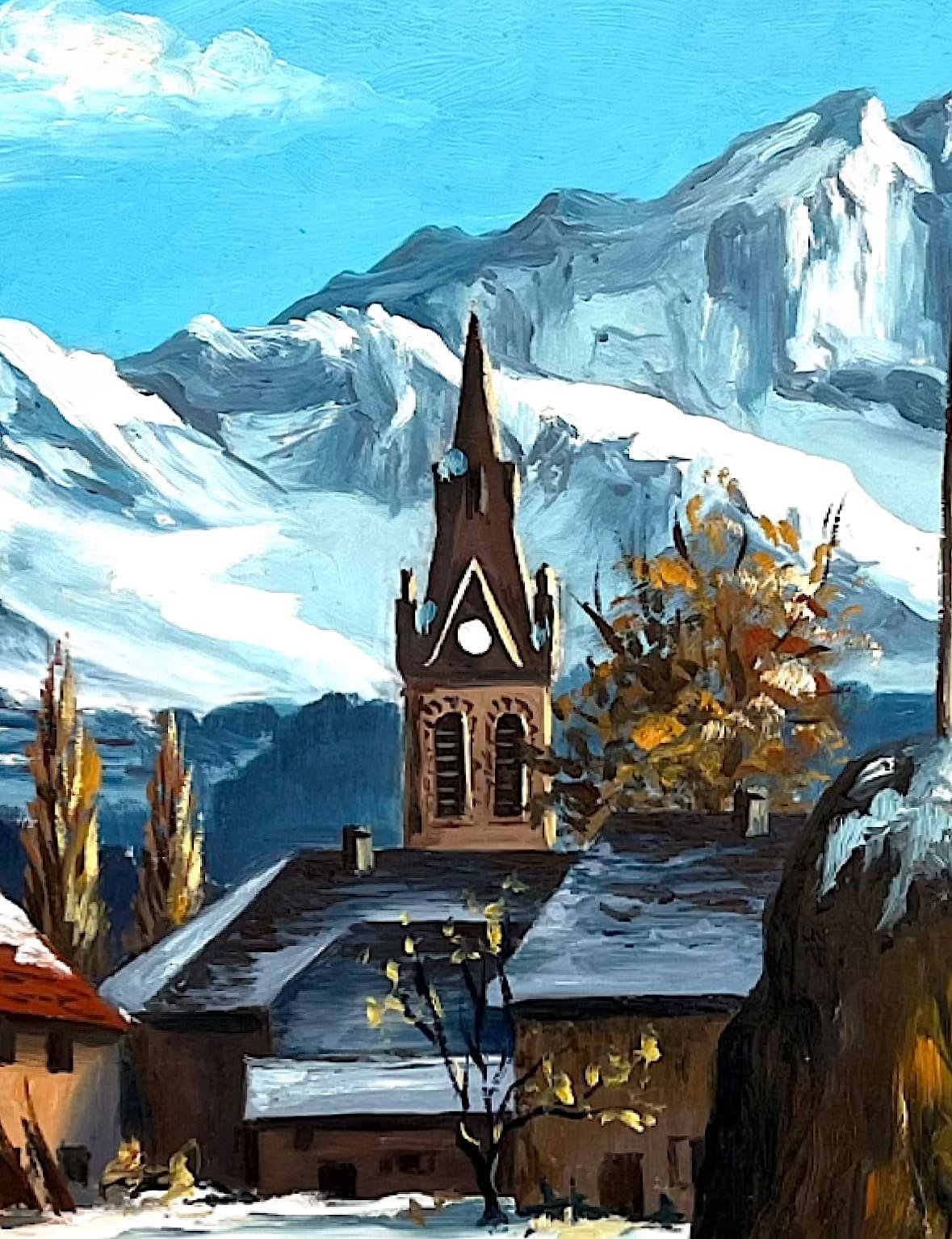 L'artiste compose une scène hivernale harmonieuse où se détache l'architecture traditionnelle alpine,