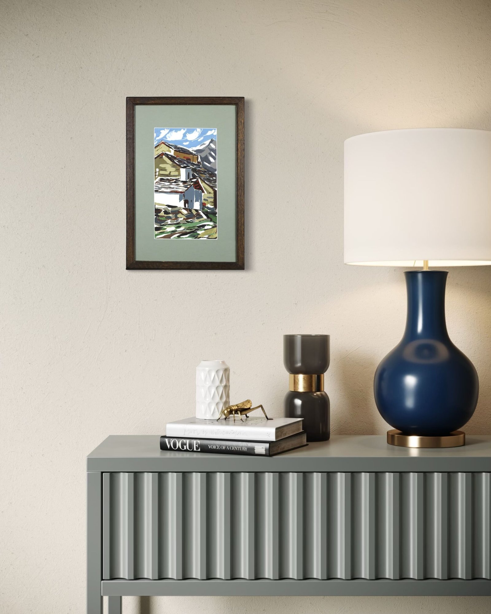 Cette œuvre représente la Chapelle de Tignes au cœur des montagnes.