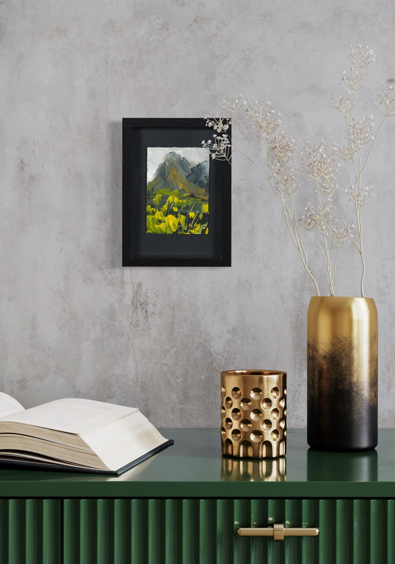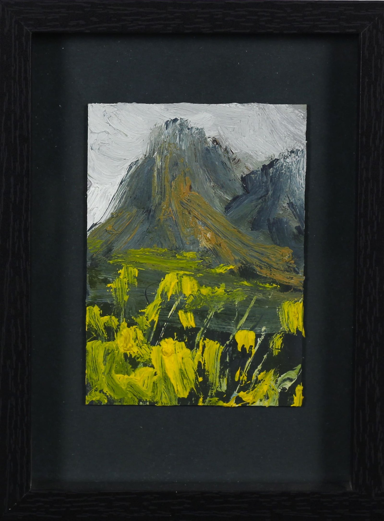 Cette petite peinture, réalisée à l’acrylique avec une touche énergique et spontanée, propose une vision stylisée et poétique du paysage alpin.