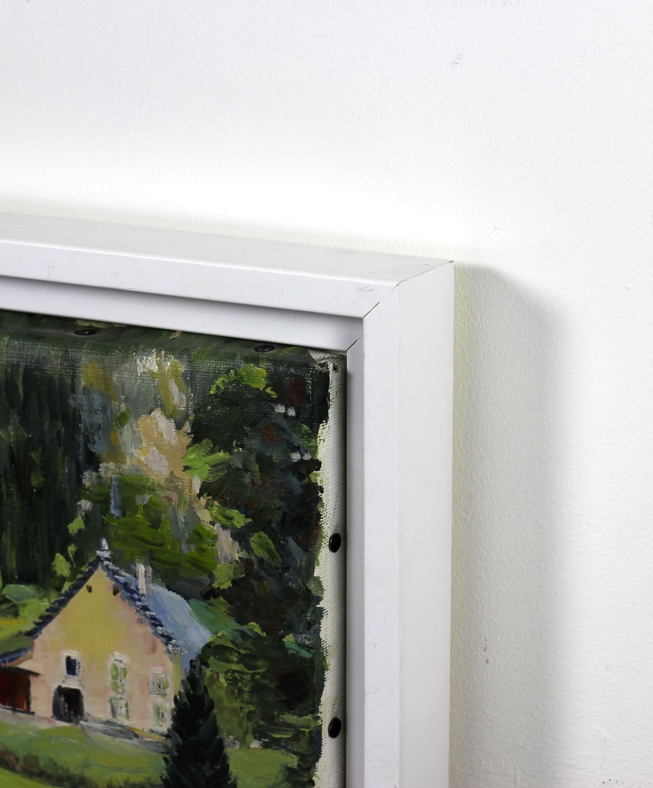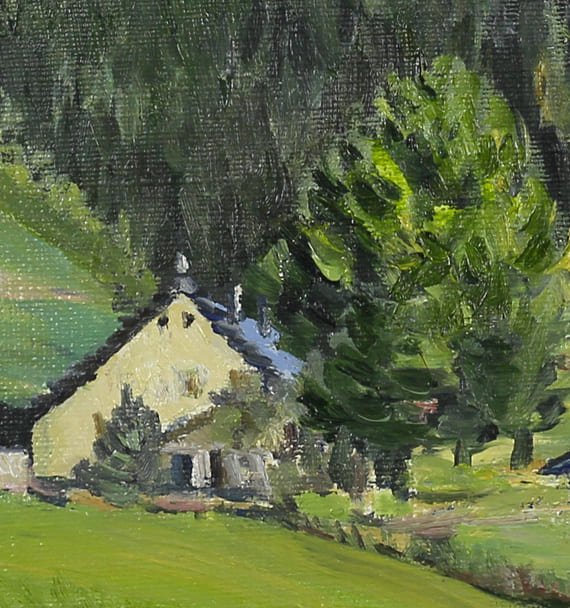 Les fermes, aux volumes simples et aux toits pentus caractéristiques, structurent la scène et servent de points d’ancrage dans la composition. Leur présence, sobrement mise en lumière, dialogue avec la densité des arbres environnants.
