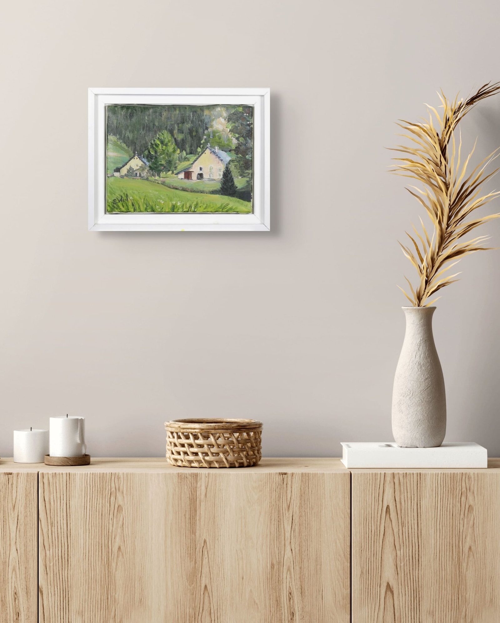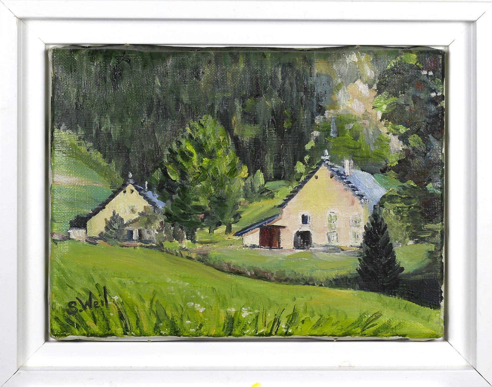 L’huile sur toile de S. Weil aborde le paysage du Vercors en articulant clairement espace naturel et architecture rurale.