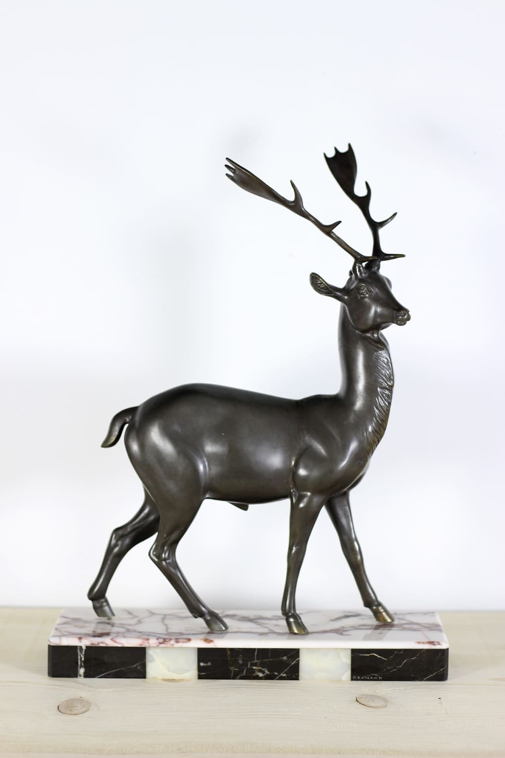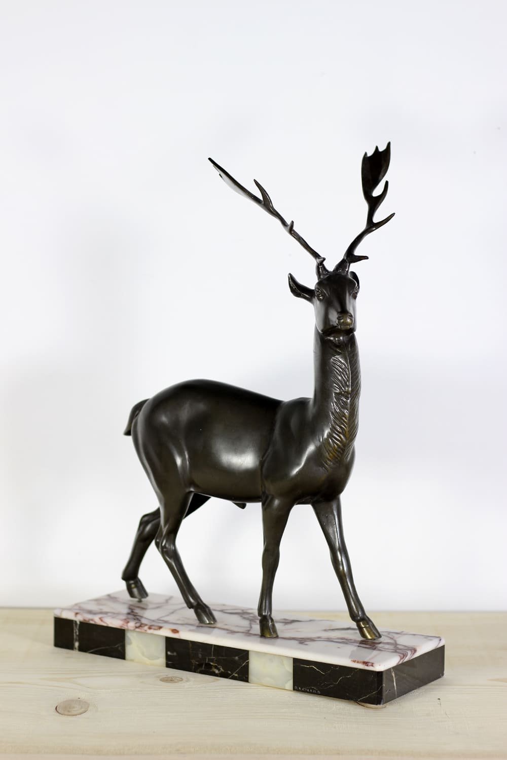 Ce cerf en bronze patiné repose sur un socle en marbre noble, témoignant du raffinement de l'époque Art Déco.