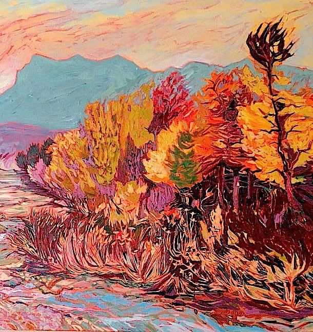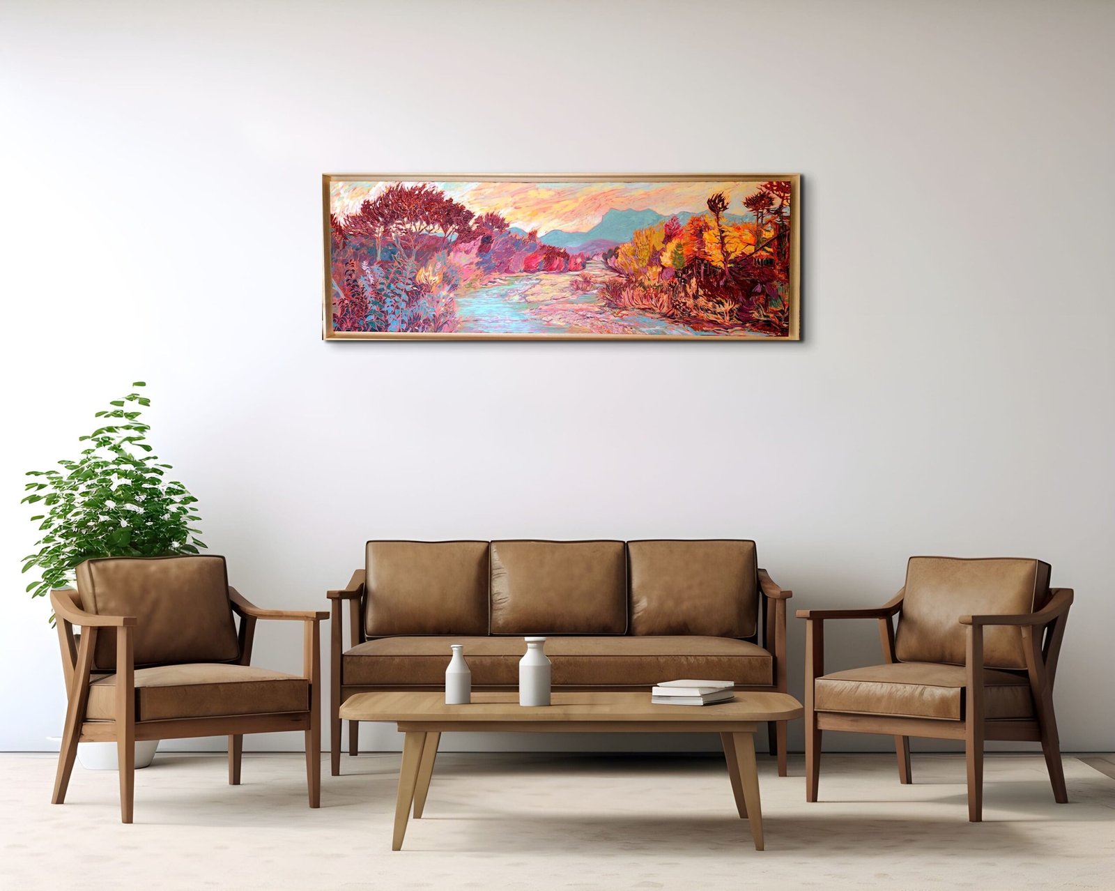 Le cours d’eau structure la composition et invite le regard à travers une végétation vibrante, baignée de couleurs chaudes et contrastées.