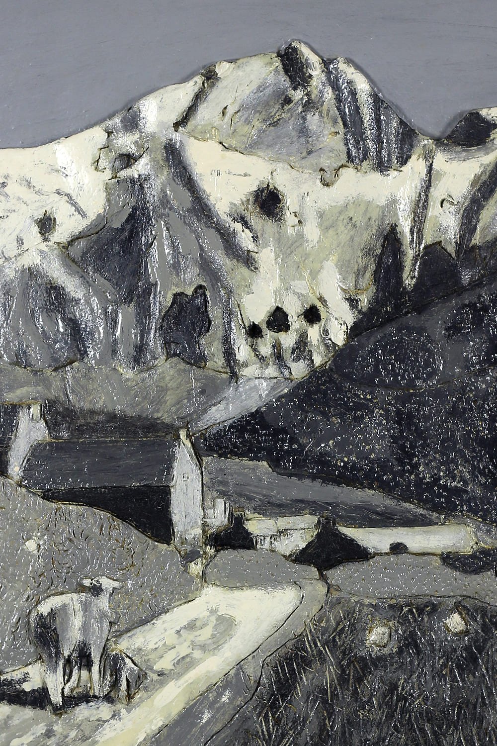 La texture sculptée accentue la monumentalité du massif enneigé dominant la composition.